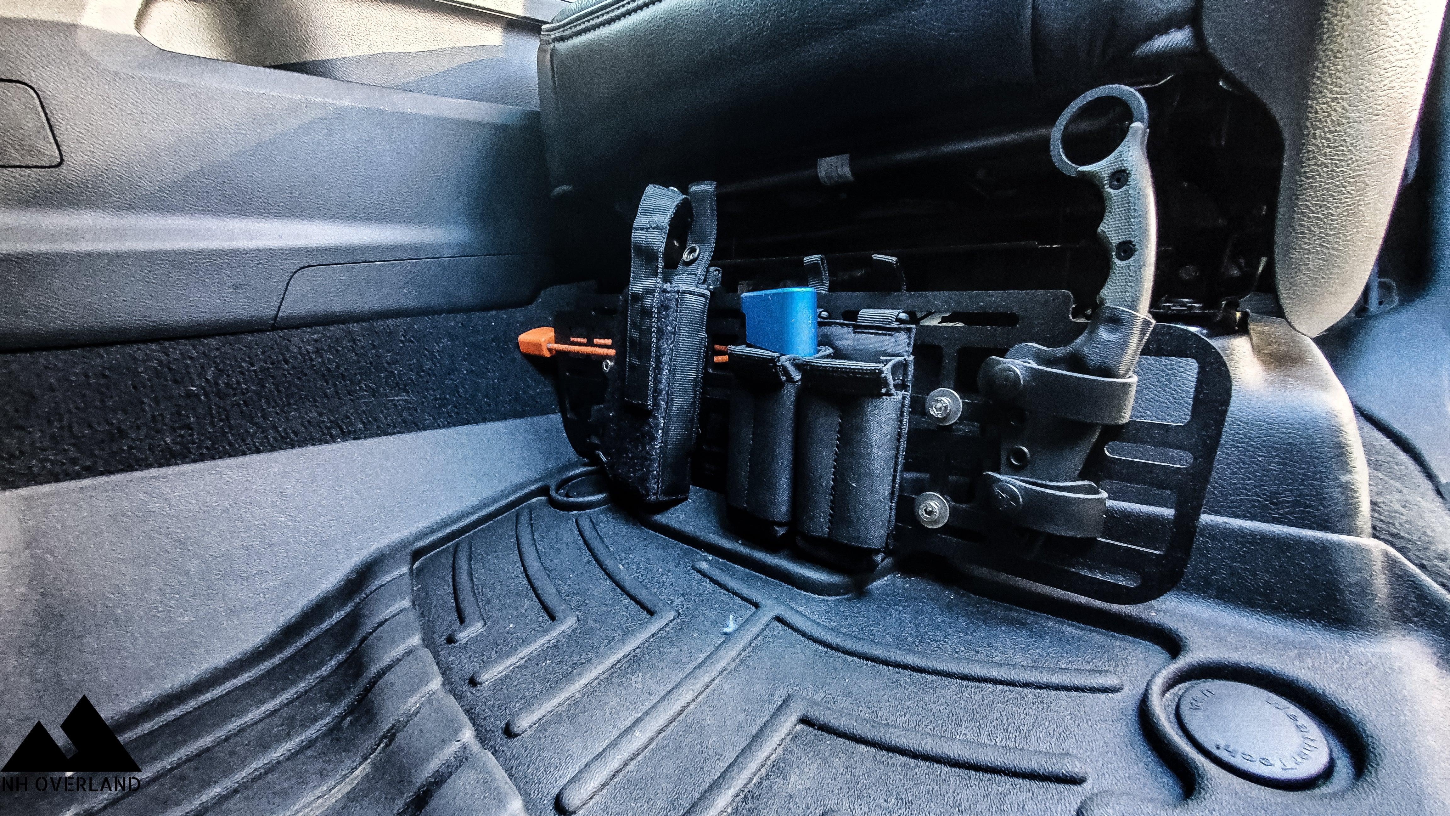 Front Seat Gear Panels mount behind the front legs of the driver and/or passenger side* seat/s keeping your you gear within reach. NH Overland Gear Panels allow for mounting a verity accessories, from Molle pouches, First aid kit, flash lights, fire extinguishers, or a holster. NH Overland Seat Front Gear Panels require no modification for installation.