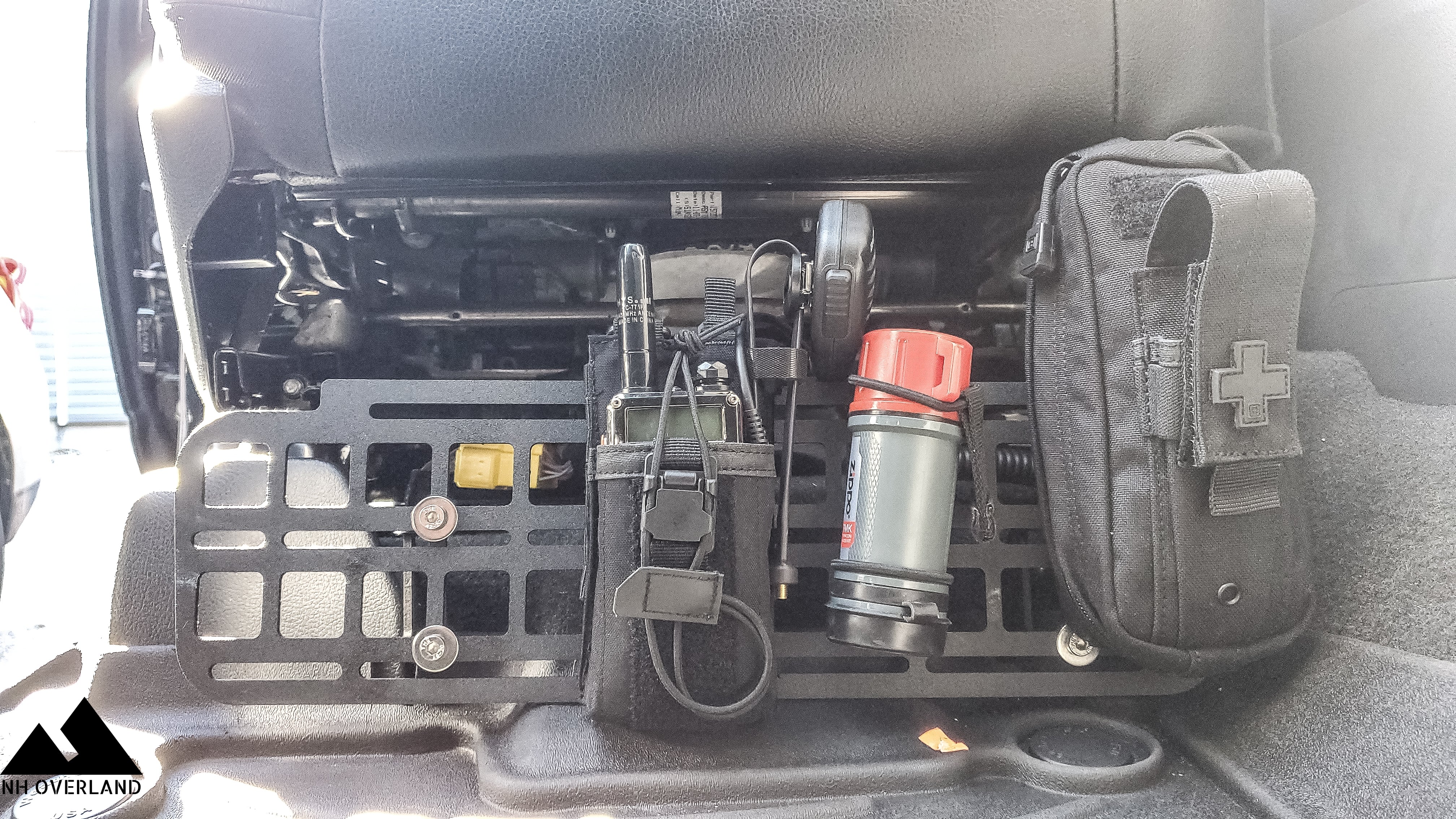 Front Seat Gear Panels mount behind the front legs of the driver and/or passenger side seat/s keeping your you gear within reach. NH Overland Gear Panels allow for mounting a verity accessories, from Molle pouches, First aid kit, flash lights, fire extinguishers, or a holster. NH Overland Seat Front Gear Panels require no modification for installation.