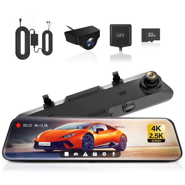 Get the ultimate driving experience with G900 4K+2.5K dashcam featuring a large touchscreen display and rear view mirror cameras.